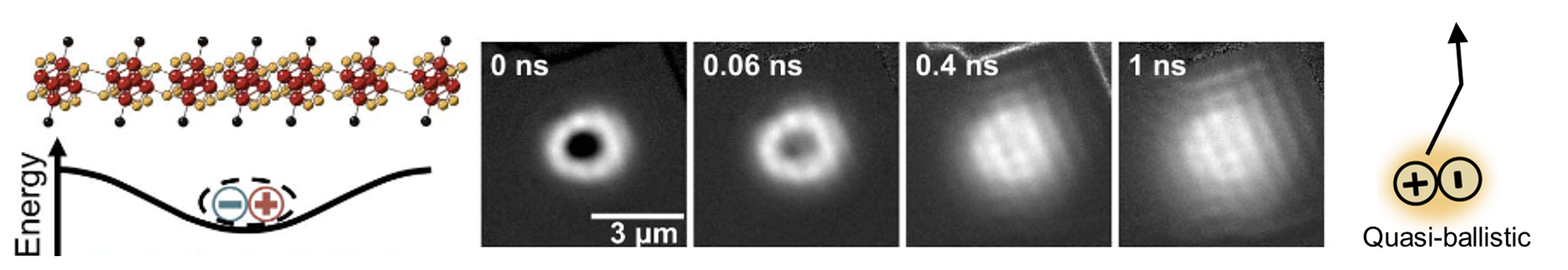 1. The PIs have developed the first semiconductor capable of sustaining ballistic (scatter-free) electronic energy flow over macroscopic scales in the superatomic semiconductor Re6Se8Cl2. Experiments and theory show that this property emerges due to strong coupling of excitons with acoustic phonons in the material. The team showed record-breaking transport at room temperature, even exceeding carrier transport in silicon (Science 2023, arXiv 2024). This discovery could enable lossless transistors for new classical and quantum computing architectures.