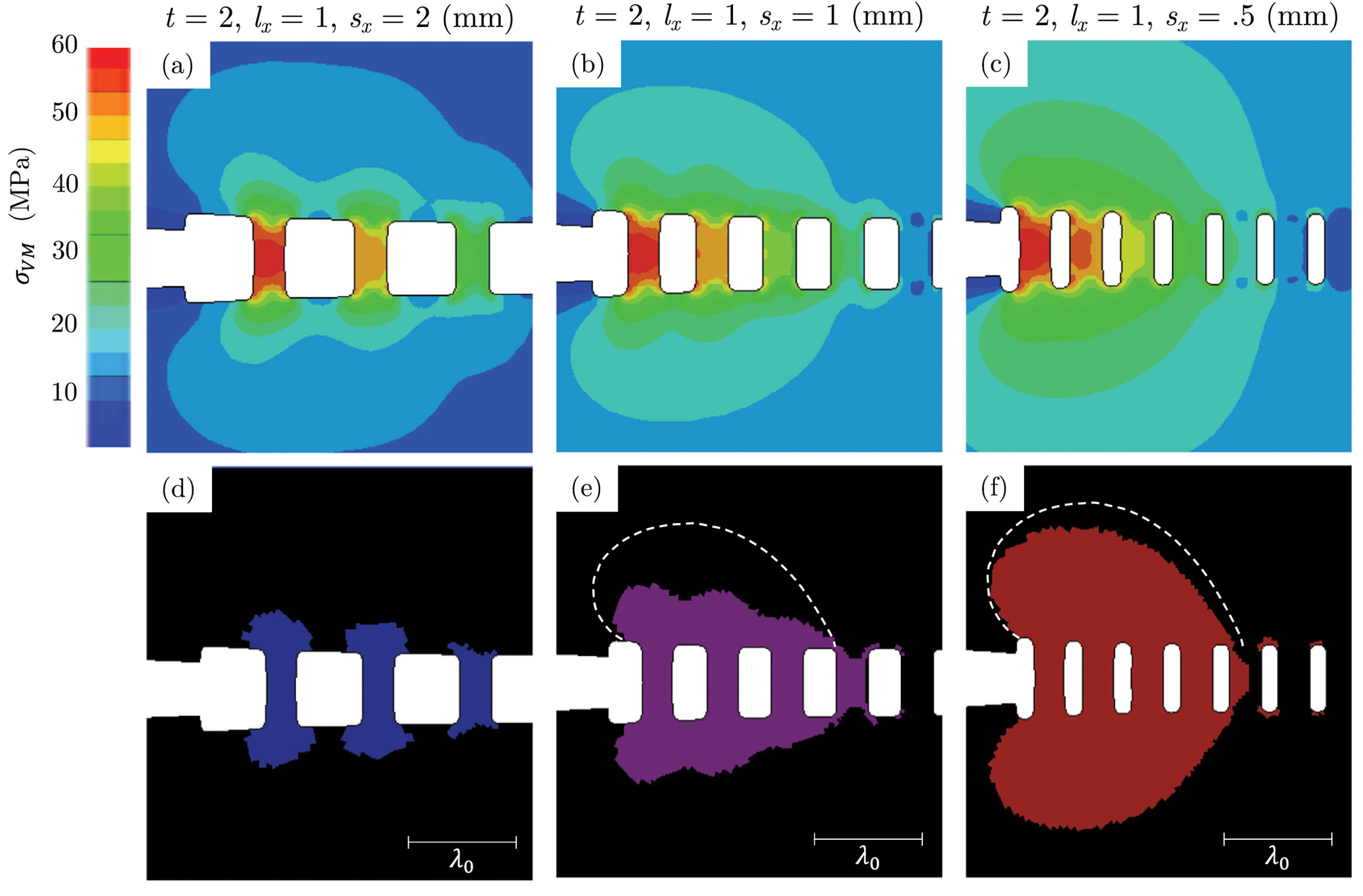 Image Caption: Simulations showing how the height (t), length (lx) and spacing (sx) alter the stress (σVM) at a crack tip and thereby prevent crack propagation and increase toughness
