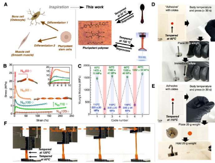 Inspired by pluripotent stem cells, that can be differentiated into a range of cells, a synthetic, pluripotent plastic has been developed (Figure A). This material can be tempered (isothermal heating before rapidly quenching) at various temperatures to access a range of room temperature properties from hard and stiff to soft and extensible (Figure B). With this ability, the materials can be used, reused, and recycled (Figure C) to access a range of common, plastic properties. Through choice of the tempering temperature, it is possible to access stiff robust materials that can used to make utensils (i.e., spoon) or soft extensible shape memory materials that can actuate and lift weights (Figure A). In addition, the materials can be tempered to have a different function. For example, the material tempered at 60 °C is stiff and can be utilized as a spoon (Figure A) but it fails as an adhesive (Figure D). However, by tempering at 110 °C the material is now soft and extensible at room temperature and can be used as a pressure-sensitive adhesive (Figure E). We also show that these materials can be differentially (or spatially) tempered (akin to the process to make swords) to access single films that have regions that are soft/extensible and regions that are have stiff/high-strength properties (Figure F).