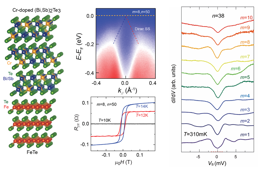 An IRG1 team employed molecular beam epitaxy to synthesize heterostructures stacking a ferromagnetic topological insulator with a quantum anomalous Hall state, Cr-doped (Bi, Sb)2Te3, and an antiferromagnetic iron chalcogenide, FeTe, with an atomically sharp interface. An unexpected phenomenon emerges: interface-induced superconductivity.