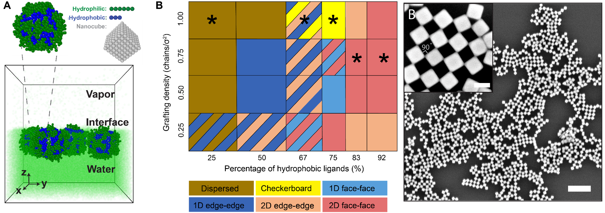 Importance of the Achievement: Checkerboard lattices—where the resulting structure is open, porous, and highly symmetric—are difficult to create by self-assembly. The successful feedback loop between molecular dynamics simulations and interfacial assembly experiments is critical for targeting these lattices, which represent a tiny fraction of the phase space associated with the polymer-grafted nanocrystals used in these experiments.