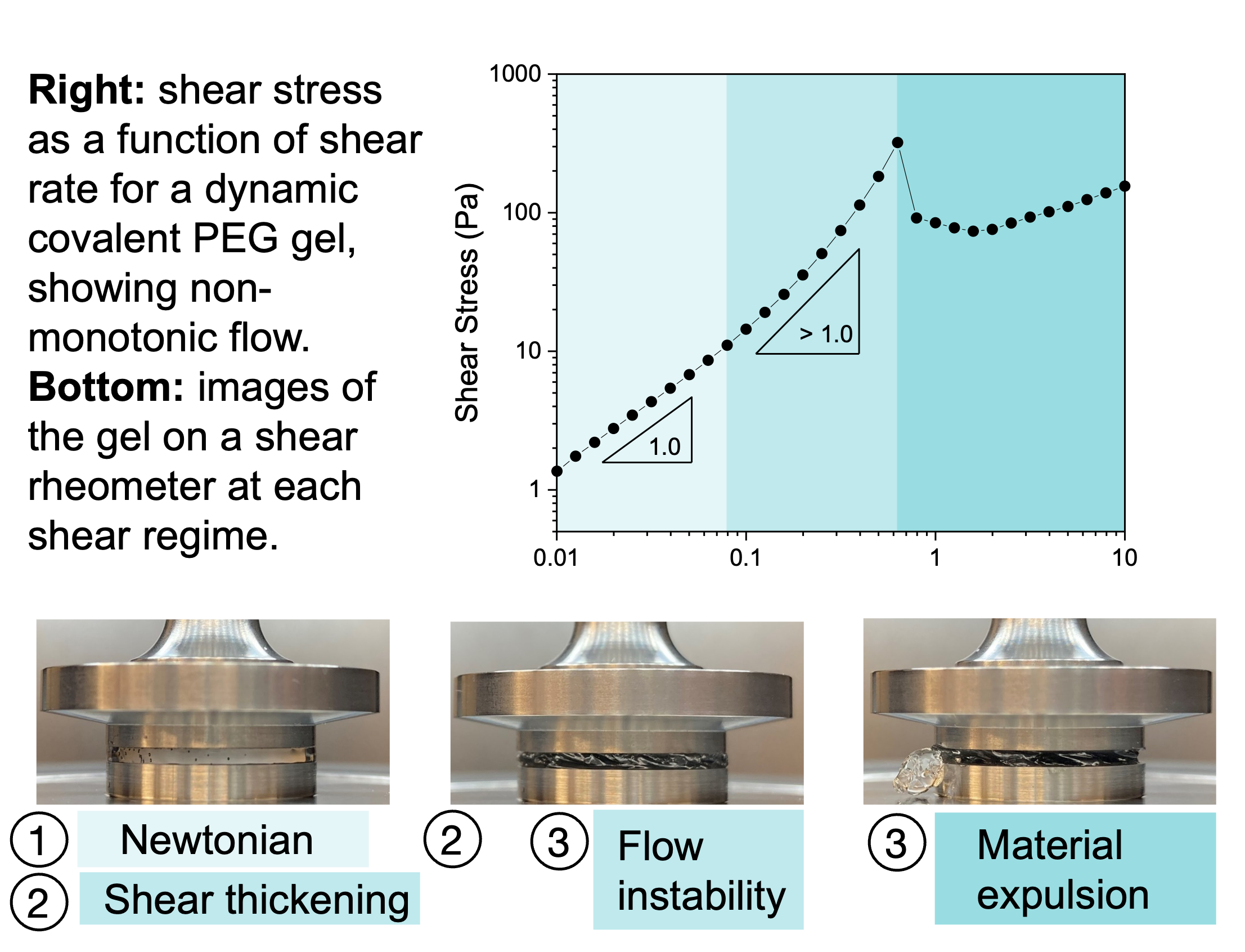 • Dynamic covalent hydrogels exhibit non-monotonic flow curves under steady shear, with shear thickening behavior that depends on exchange kinetics of linkers.