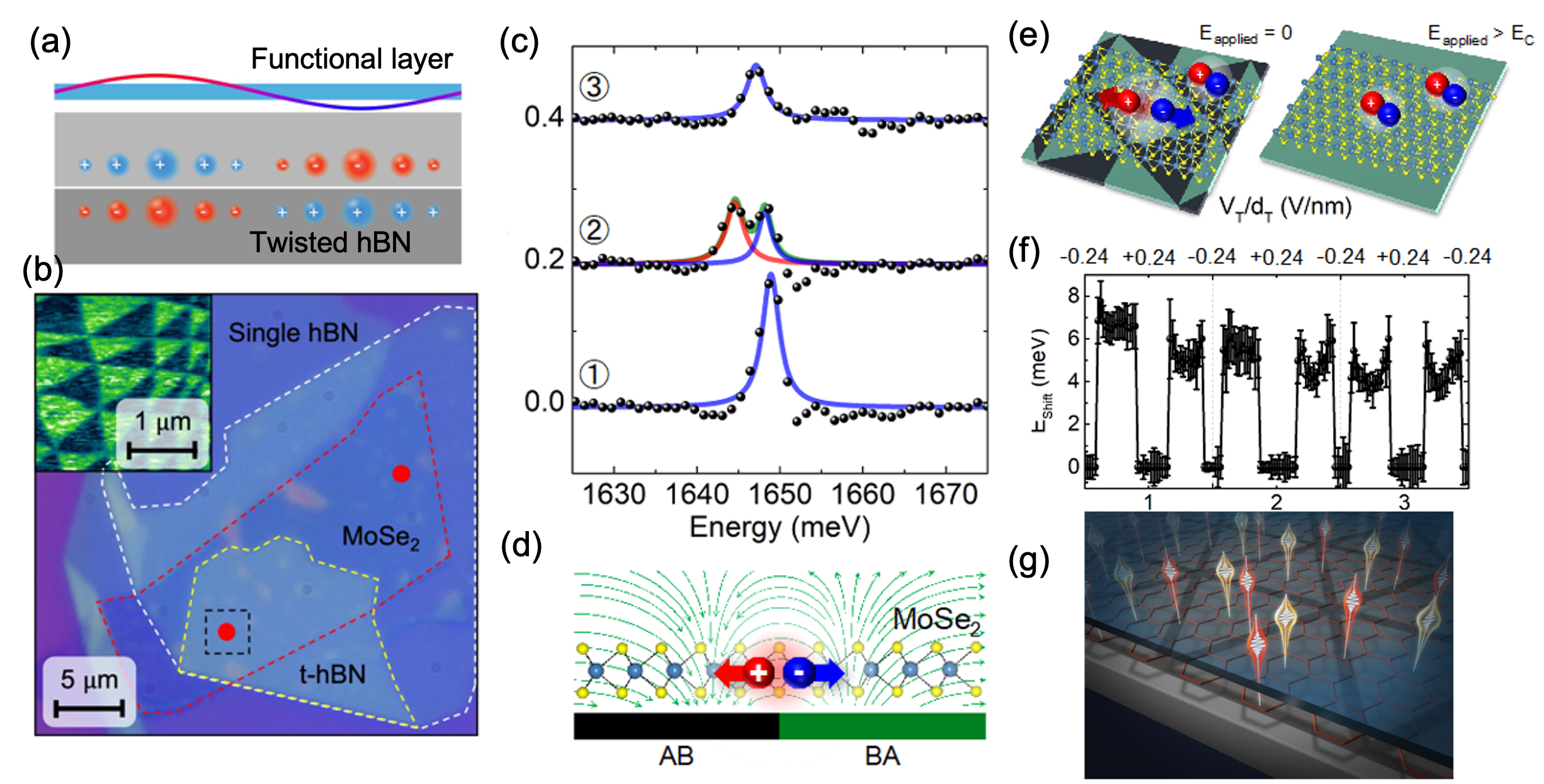 - Twisted hBN substrates leads to ferroelectric domains due to inversion symmetry breaking at the interface; the electrostatic potential on the top surface may be used to modify properties of an adjacent layer