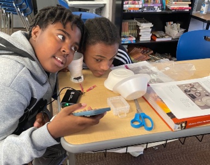 In February 2024, I-MRSEC investigator Daniel Shoemaker, grad student Emily Waite, and outreach coordinator Pamela Pena Martin taught 35 7th and 8th graders at Franklin STEAM Academy, a Champaign public middle school, about magnetism through a kit they developed, supported by the I-MRSEC and a grant from the APS Group on Magnetism and its Applications (GMAG). This visit was part of an annual 7-week program that teaches materials science concepts through hands-on activities aimed to build interest and confidence in STEM. Waite created the kits, supported by Shoemaker and Pena Martin, and the team led the lesson for two classrooms.