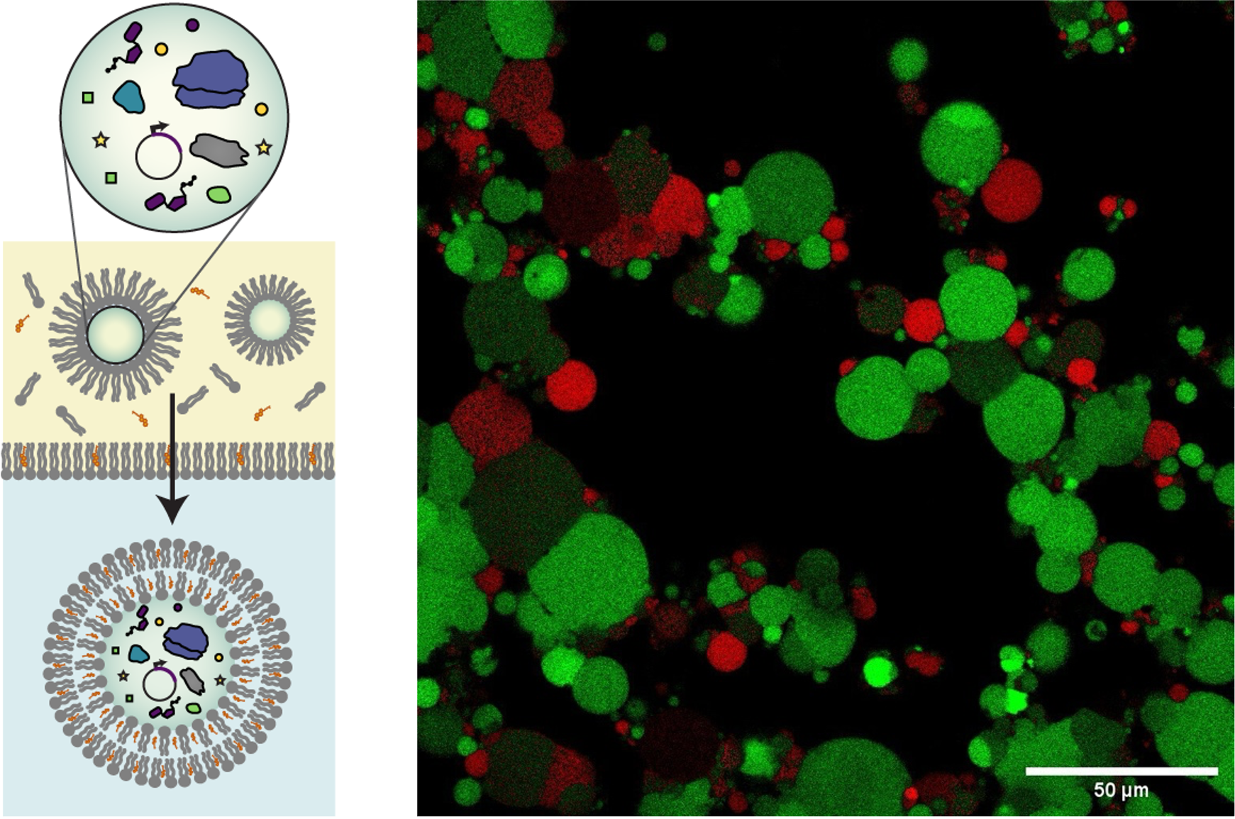 A critical element of Northwestern University MRSEC IRG-1 is interfacing cell-free systems with abiotic materials in a way that supports cell-free reaction efficiency and kinetics. In this work, the capacity of bilayer-based compartments (e.g., liposomes, polymersomes) is being assessed to support encapsulated cell-free reactions upon their inclusion in a larger hydrogel matrix. In particular, giant unilamellar vesicles (GUVs) have been assembled from a phospholipid mixture to enable transcription and translation of a fluorescent protein after GUVs are encapsulated in an alginate hydrogel. This hydrogel/vesicle system is serving as a platform to investigate how vesicle stability and reaction kinetics are impacted as a function of vesicle composition, cell-free extract type, and hydrogel matrix composition. This work is setting the stage for more advanced cell-free reactions that will be initiated based on the presence of an externally detected or added small molecule.