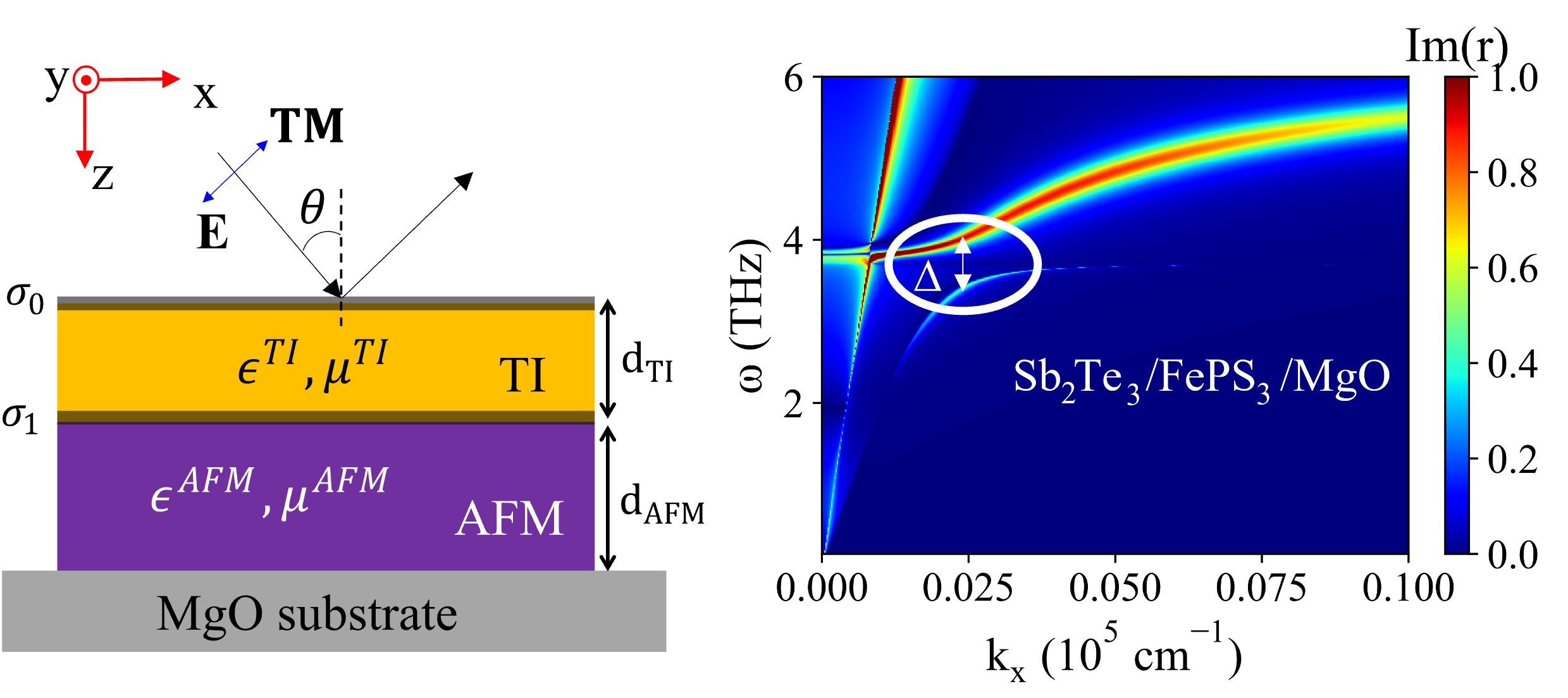 - State-of-the-art global scattering matrix method combined with Drude-Lorentz and Heisenberg models used for semi-classical descriptions of the interaction between TI and AFM through dispersion of Dirac plasmon-phonon-magnon polariton.
