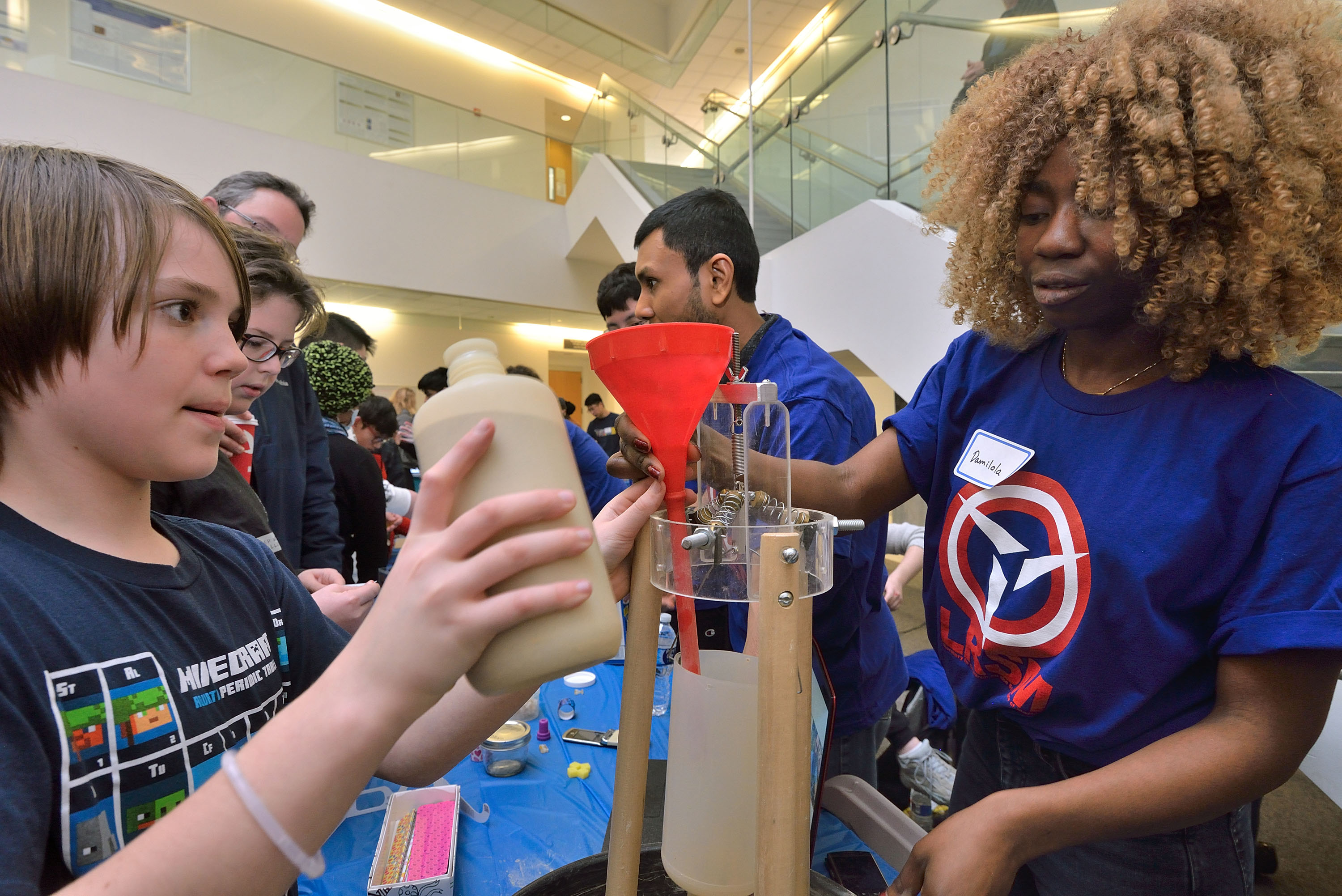 image: Damilola Lawal, from the Raney lab, demonstrates The Utility of Instability to a K-12 student.