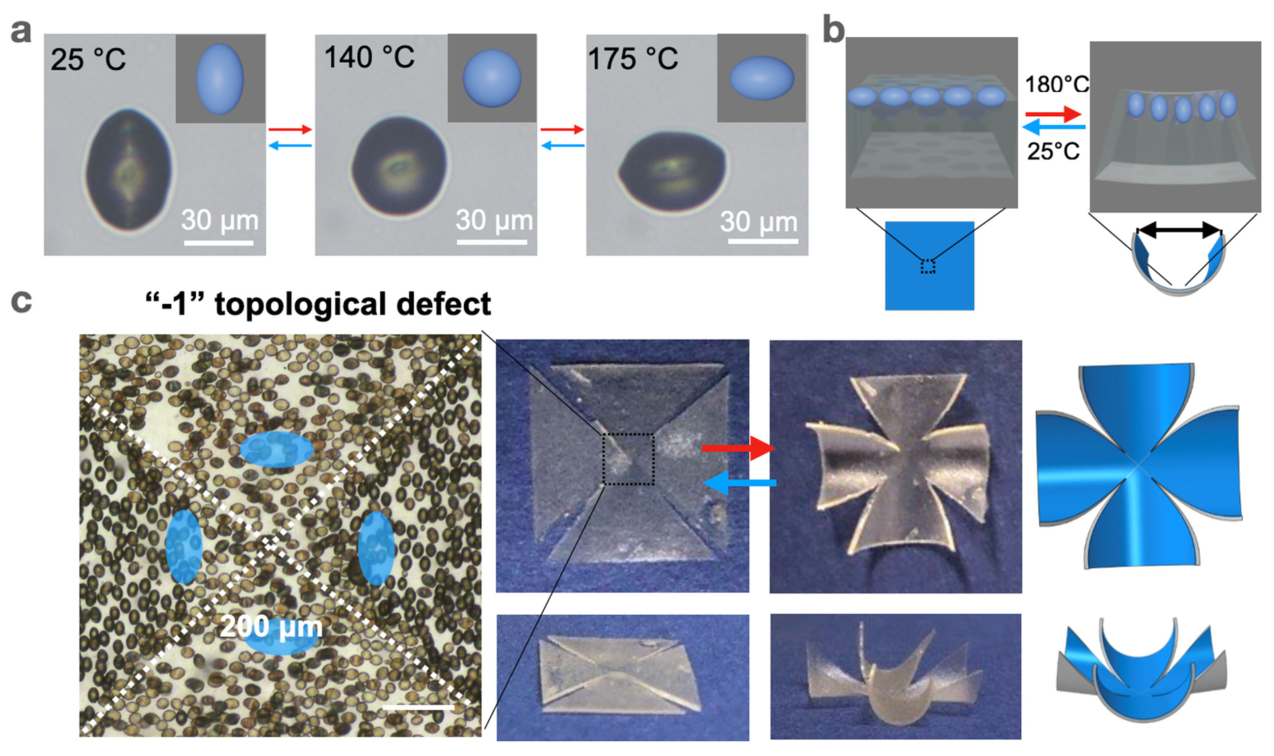 Fig. 1. (a) Optical images of a temperature responsive LCE spindle microparticle. (b) Schematic of directed bending of a soft matrix embedded with LCE microparticles. (c) (L) Bright-field microscopy images of the dually responsive LCE microparticles programmed with different orientations under the magnetic field. (M) Photographs of the initially flat sheet that bends along the in-plane directions at 180oC with cuts along the intersections. Cut length: 0.4 cm. (R) Finite element simulations of the bent film. Sample size is 1 cm x 1 1 cm x 200 μm.