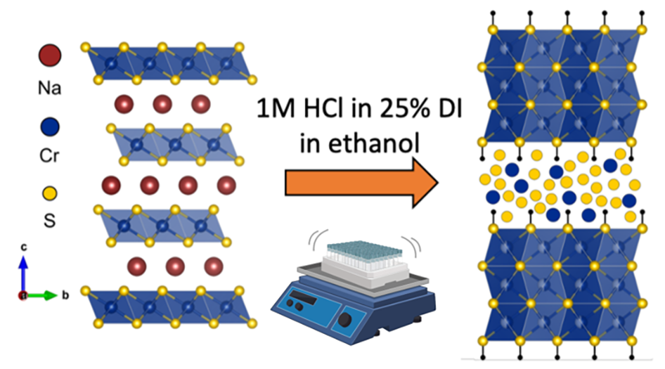 Princeton researchers have demonstrated that acid pre-treatment of NaCrS2 to form a new phase (named HxCrS2) results in significant improvements to the material’s performance as a sodium battery electrode. Acid exchange to remove sodium from NaCrS2 is accompanied by a phase transformation to a biphasic structure with alternating amorphous and crystalline layers. This unique structure allows for faster diffusion of Na+ and results in higher capacities that can be sustained over longer cycling lifetimes. Specifically, their new material features a capacity of 728 mAh/g that is maintained throughout cycling and is nearly double the reversible capacity of NaCrS2 in the same potential region. HxCrS2 also features a Na+ diffusion constant on the order of 10,000 times faster than in NaCrS2.