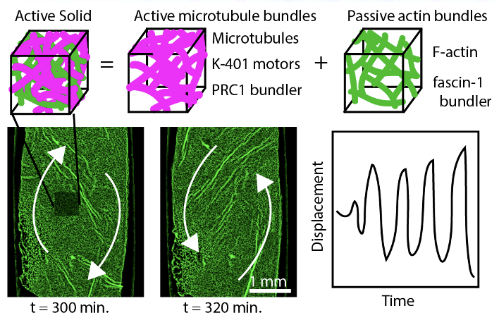 Active composites obtained by merging a conventional soft matter actin gel with energy consuming microtubule bundles that generate active stresses leads to emergent properties not present in the individual systems. Here, the system exhibits coherent large scale self-driven oscillations, which neither the actin gel nor microtubule bundles will do on their own. The Center will exploit this phenomena to build autonomous soft robots with lifelike attributes.