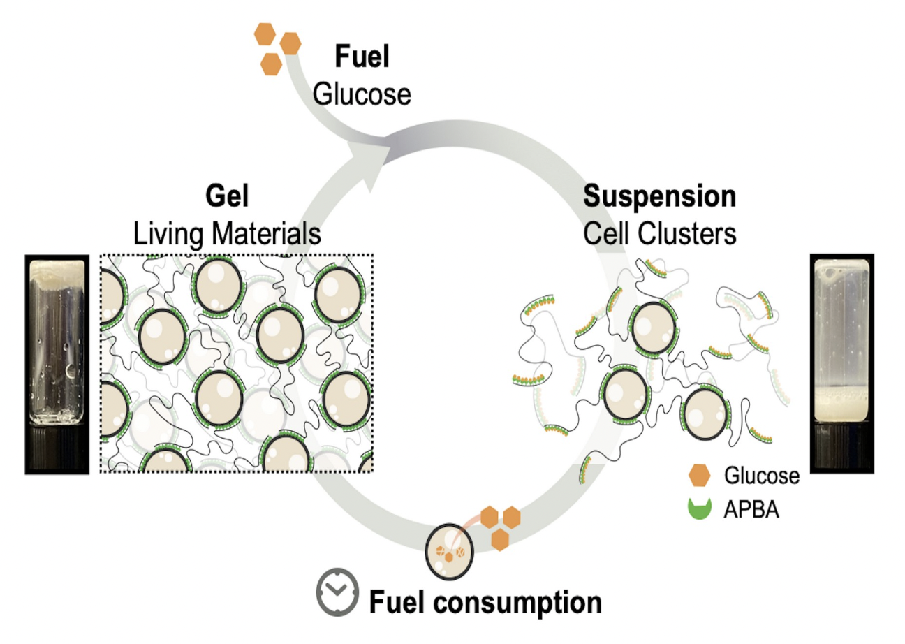 - The first example of synthetic living material featuring dissipative behaviors directly controlled by the fuel consumption of their constituent cells