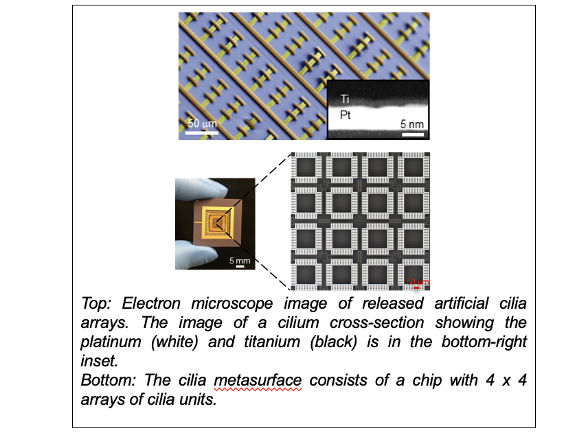 Many organisms use cilia to control fluids at the microscale. Engineering a cilia platform with comparable capabilities, however, has remained elusive. Now, Cornell researchers have taken a step towards such systems by creating electronically-actuated artificial cilia that can create arbitrary flow patterns in liquids near a surface. The team first created voltage-actuated cilia that can drive surface flows at tens of microns per second with only 1 volt applied. In a second demonstration, they fabricated robotic cilia that can be controlled locally to generate and switch between desired surface flow patterns. Finally, they integrated the cilia with a light-powered clock circuit on a chip and demonstrated wireless operation. With this circuit the team was able to drive the cilia in the wave-like pattern that is characteristic of natural cilia and underlies their efficiency. These results, demonstrated experimentally and confirmed using theoretical computations, illustrate a new pathway to microfluidic manipulations, with applications that include microfluidic pumping and microrobotic locomotion.