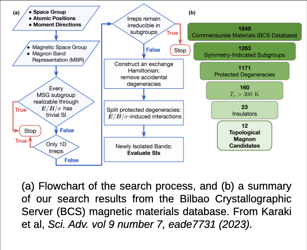 - Unlike weakly interacting electronic materials that are well captured by density functional theory and ab initio calculations, it is very difficult to make reliable predictions on strongly correlated magnetic materials. IRG-2’s symmetry-based approach overcome this challenge, and our search results greatly expand the list of high-Tc candidate materials for topological magnons.