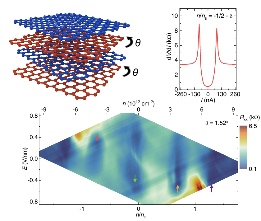 - At certain magic angles the electron velocity isgreatly reduced, leading to spectacular effectslike superconductivity, and magnetism