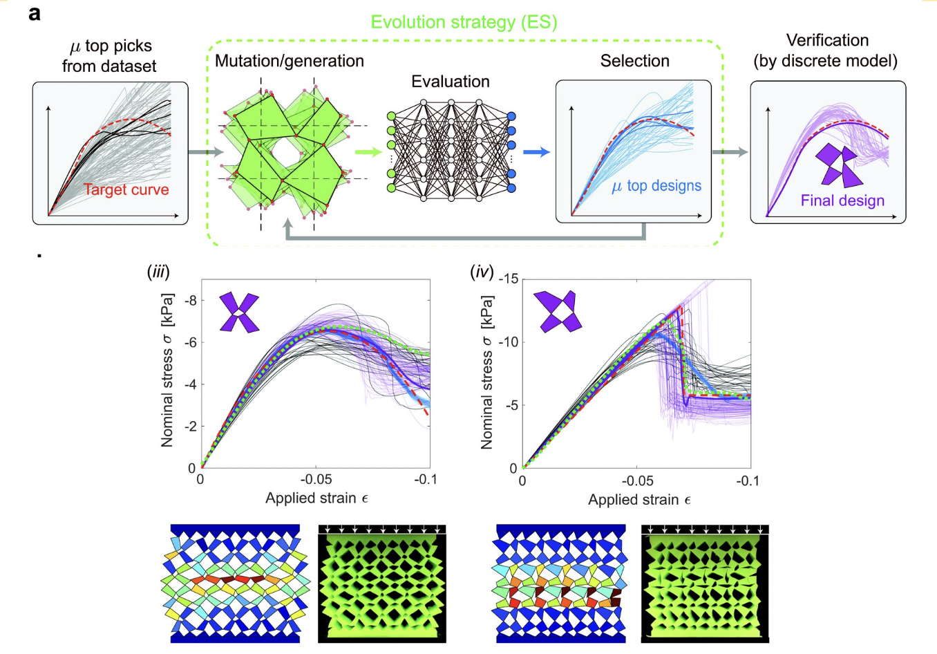 A team at the Harvard MRSEC led by Bertoldi and Rycroft has developed a framework to design mechanical metamaterials with target nonlinear response. Neural networks were used to accurately learn the relationship between the geometry and nonlinear mechanical response of these metamaterials. Next, neural networks were combined with an evolution strategy to efficiently identify geometries that exhibit target nonlinear stress-strain behaviors. Their neural accelerated evolution strategy holds potential for a range of applications that benefit from systems with a target nonlinear mechanical behavior, as demonstrated by the design of energy absorbing systems, soft robots and morphing structures.
