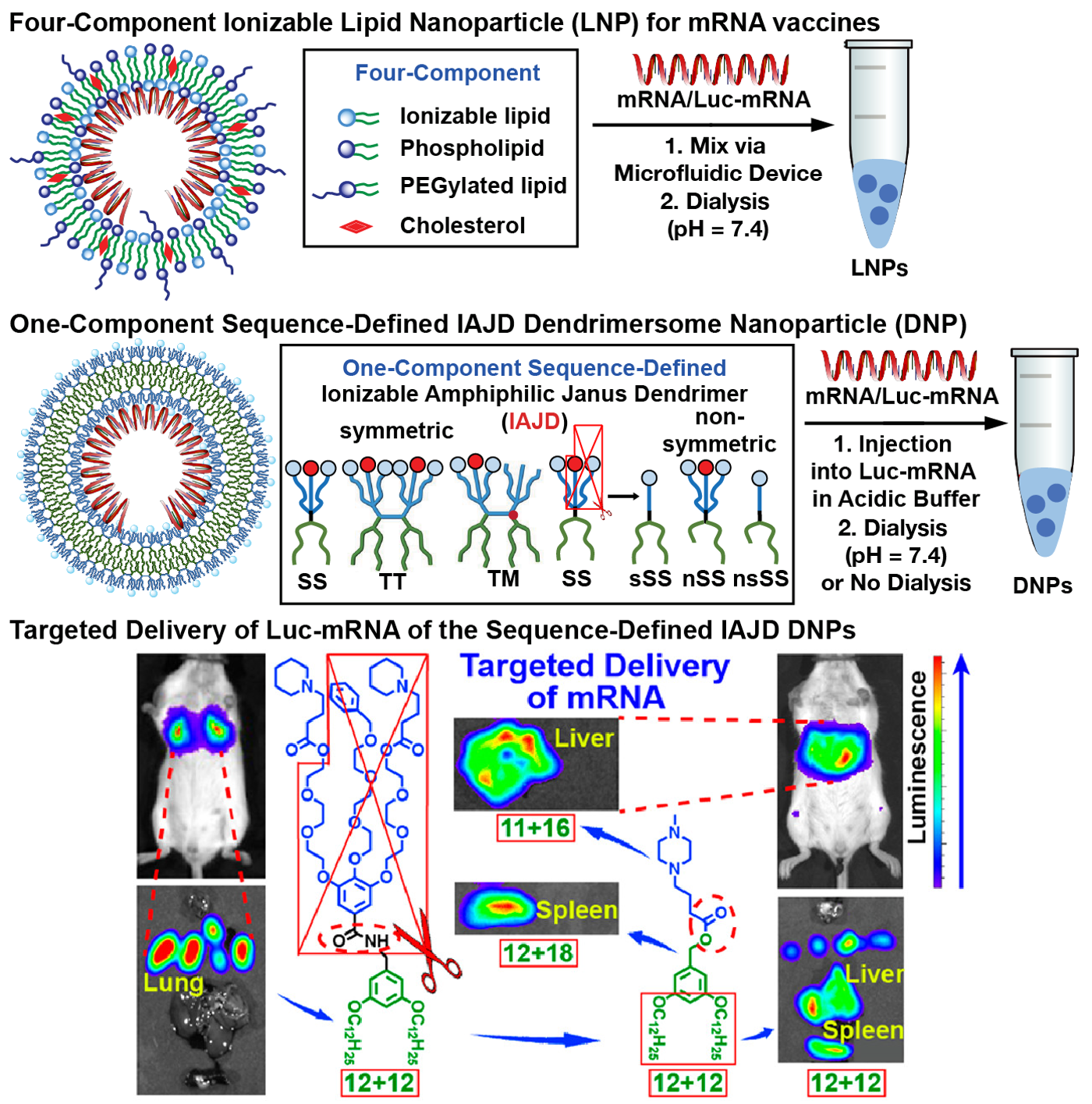 We developed one-component, sequence-defined Ionizable Amphiphilic Janus Dendrimers (IAJDs) and their assemblies with mRNA. These Dendrimersome Nanoparticles (DNPs) were investigated for the delivery of mRNA for vaccines and nanotherapeutics. The DNPs have the potential to make less expensive, more stable, and easily stored vaccines against viruses compared to the current 4-component Lipid Nanoparticles, LNPs. We have shown that the structural design of the IAJD molecules allows the formation of DNPs that selectively deliver Luc-mRNA to the lung, liver, spleen, and lymph nodes. Simplifying the IAJD structure allows us to change the delivery from lung to liver and spleen. The DNPs elaborated in this work are excellent candidates for more efficient and less expensive vaccines than the current ones.
