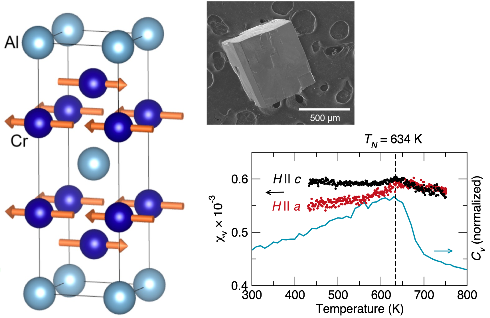 The leading antiferromagnetic spintronic material Mn2Au cannot be “switched off” by heating above its Néel temperature TN, so probing its magnetic energy experimentally is challenging. We grew the first single crystals of Cr2Al to show that it has the same magnetic configuration as Mn2Au (at left, orange arrows), but Cr2Al transitions to a paramagnet at TN = 634 K. Neutron diffraction revealed that the magnetic ordering is in-plane. Divergence of the magnetic susceptibility χv along a and c directions is clear at TN (right, in black and red). Our Monte Carlo simulations match the experimental TN, shown by the peak in calculated heat capacity (Cv at right, in blue).