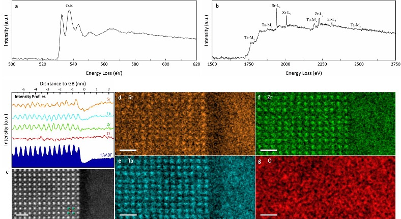 · Aberration-corrected scanning transmission electron microscopy and spectroscopy, along with an active learning moment tensor potential, were used to reveal the atomic scale structure and composition of LSTZ0.75 GBs.