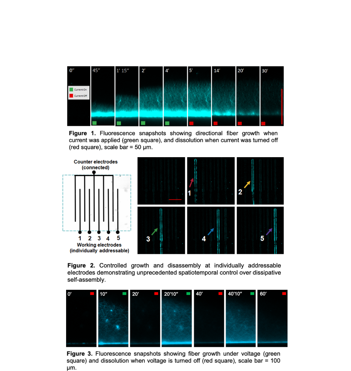 Current synthetic dissipative self-assembly systems are fueled either by chemicals or light. Here, the UCI MRSEC team have developed the first electrically-fueled dissipative system that offers rapid kinetics, directionality, and unprecedented spatiotemporal control, closely mimicking systems found in nature. The electrochemically-fueled active, dynamic, and directional assembly is shown in Figure 1. Excitingly, the system demonstrates an unprecedented level of spatiotemporal control of self-assembly (Figure 2).