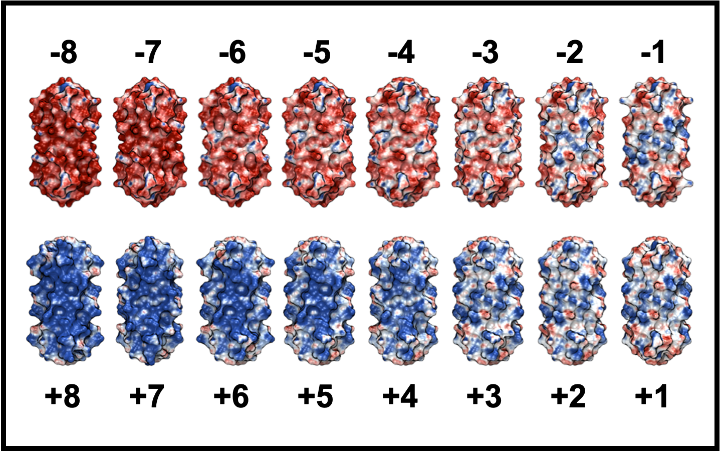 - A probabilistic peptide design algorithm was applied to identify peptide sequences with putative charge states spanning -8 to +8 for a tetrahelical backbone.