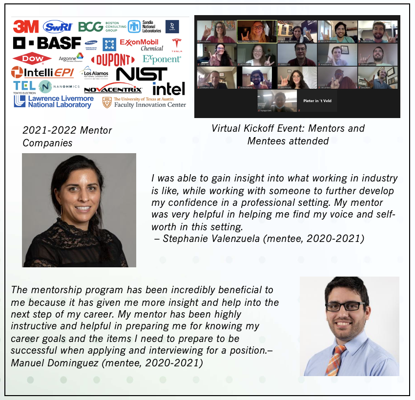 The Industrial Mentorship Program connects undergraduate students, graduate students and post-doctoral fellows to a mentor in industry. This program is designed to (i) expose participants to fundamental research as it relates to societal and economic development; (ii) enable them to broaden their networks; and (iii) facilitate a successful transition into the workforce. This program entered its fourth program cycle during 2021-2022 with a record number of mentees – 37 in total, with 10 of those students from the CIMA PREM at Texas State University. The 2021-2022 mentor cohort consisted of thirty-six industry professionals from twenty-two different companies like 3M, BASF, DuPont, Intel, Samsung and Tesla. Mentors were asked to meet with their mentees, monthly (Oct. – May) and work with their mentees to develop goals and objectives for their time together (e.g., assist in securing internship or job, enhance interpersonal skills, learn about that particular company/industry, etc.). Travel grants were also available to enable mentees to visit their mentor companies for tours, networking, and presenting their research. Outcomes from this program are measured each year with mentees from the 20-21 cohort reporting they either agreed, or strongly agreed, that they have a better understanding of career opportunities in their field, are more knowledgeable about industry trends, feel more confident to take the next steps in their career, improved their interpersonal skills and/or their professional communication skills, and grew their professional network and built relationships through their mentor. This program has impacted more than 75 CDCM students since its inception.