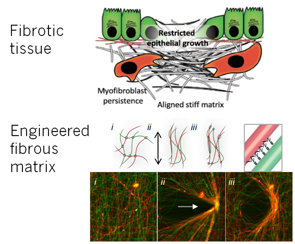 Figure: During fibrosis, collagen fibers become denser and aligned. Engineered fibrous matrices now respond to mechanical loading to densify and align fibers through inter-fiber adhesion.