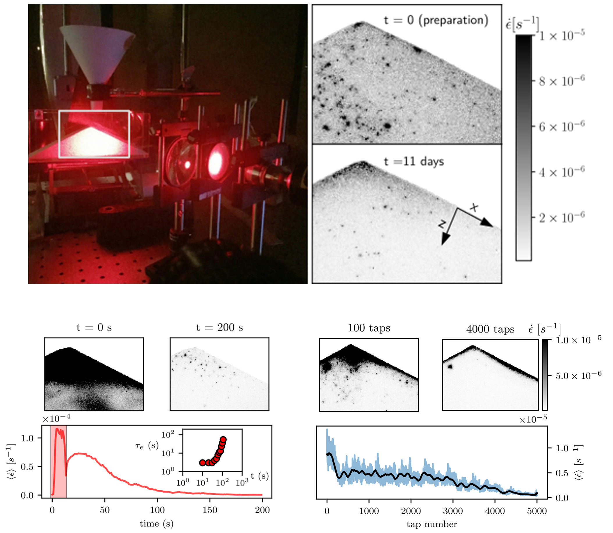 Figure: (Top) Experimental setup (left) and map of creep strains within the sandpile measured via Diffusive Wave Spectroscopy (DWS) (right). At the moment of preparation and up to 11 days after pouring (right), spatially-heterogeneous creeping motions appear within the pile. (Bottom) Heat perturbations reset the creep rate and the timescale of relaxation (left) while tapping reduces the creep rate, and confines deformation to the free surface (right)