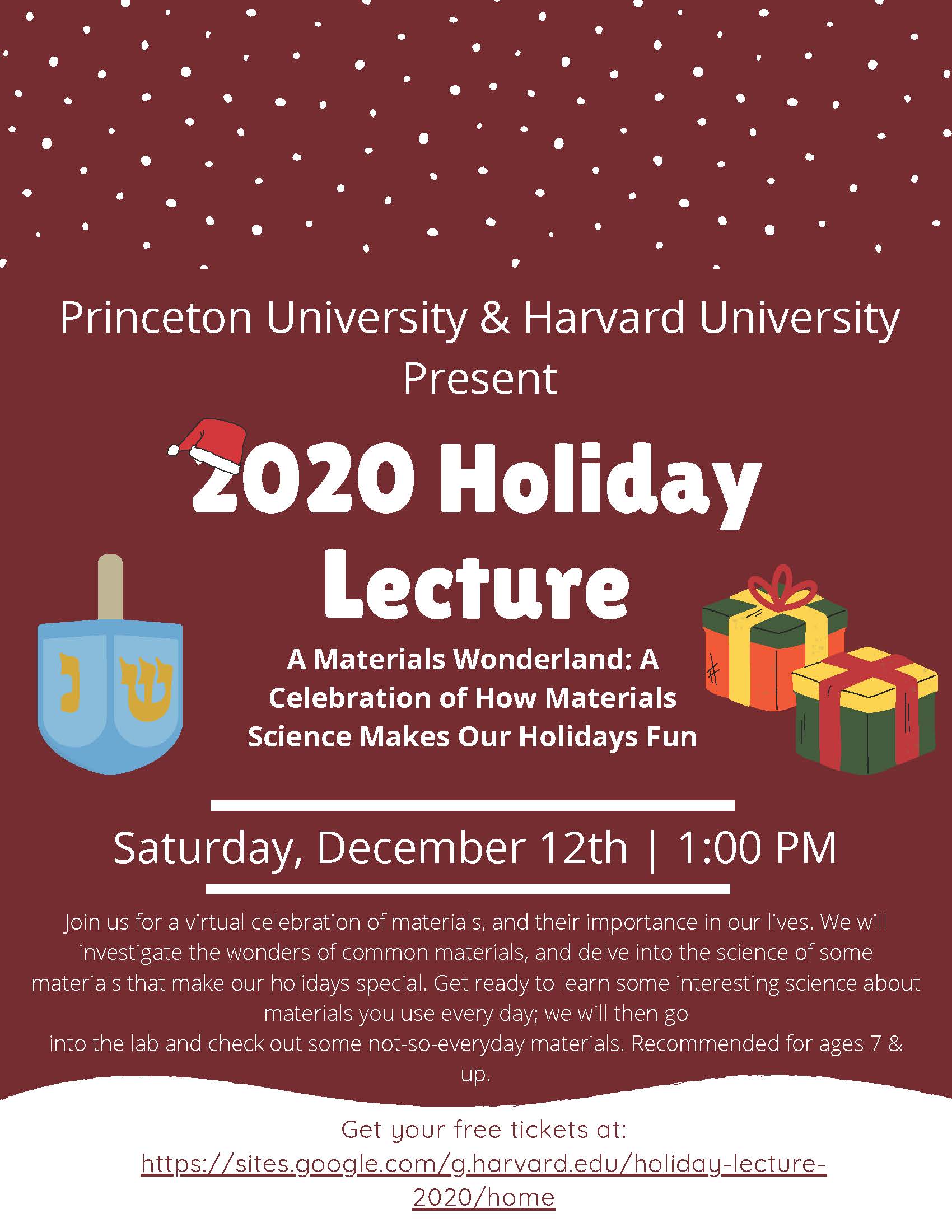 The Holiday Lecture series is modeled on a famous set of presentations first given to children a century ago as part of the Royal Institution Christmas Lectures in London. The lectures highlight science in an engaging and fun forum for children age 7 and up. This event, which is free and open to the public, brings science to the community through experiments, audience participation, and highlights from current research. The lecture is a collaborative effort of the NSF MRSEC at Harvard and the NSF MRSEC at Princeton.