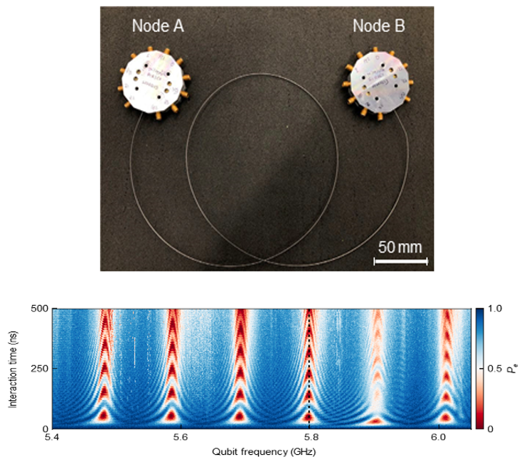 The Cleland and Schuster groups at the University of Chicago have demonstrated multi-bit entanglement in a Quantum Network. At top is a photograph of the quantum network assembly, where each node is in a machined-aluminium sample holder connected internally to the superconducting cable. Vacuum Rabi oscillations within the six standing modes in the coaxial cable (bottom) where the interaction time as a function of the Qubit Frequency are plotted.