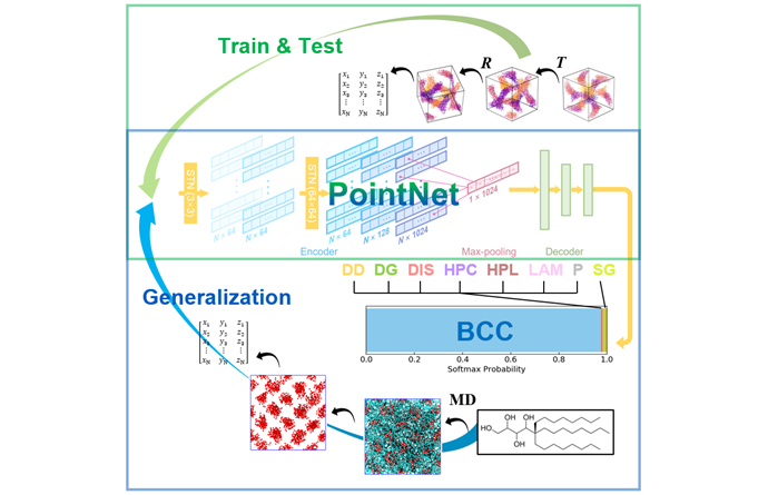 We developed a machine learning approach, called PointNet-meso, for mesophase classification including different network morphologies (double gyroid, single gyroid, double diamond, and plumber’s nightmare). The trained PointNet-meso model achieves an accuracy as high as 0.99 for globally ordered morphologies formed by linear diblock, linear triblock, and 3-arm and 4-arm star block oligomers, and it also allows for the discovery of emerging ordered patterns from non-equilibrium systems.