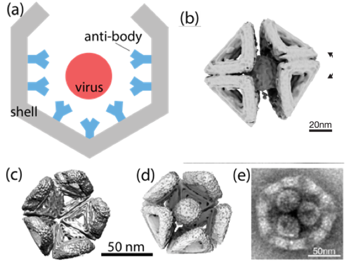 Researchers have developed programmable DNA origami building blocks that self-assemble into icosahedral shells, with programmable sizes. The shells can be functionalized with antibodies, enabling them to engulf and neutralize natural viruses. Blocking infection requires just one binding event between the virus and encapsulating shell. In contrast, the traditional antibody approach for virus neutralization must bind hundreds of viral surface proteins due to their high redundancy in attachment to host cell surfaces.