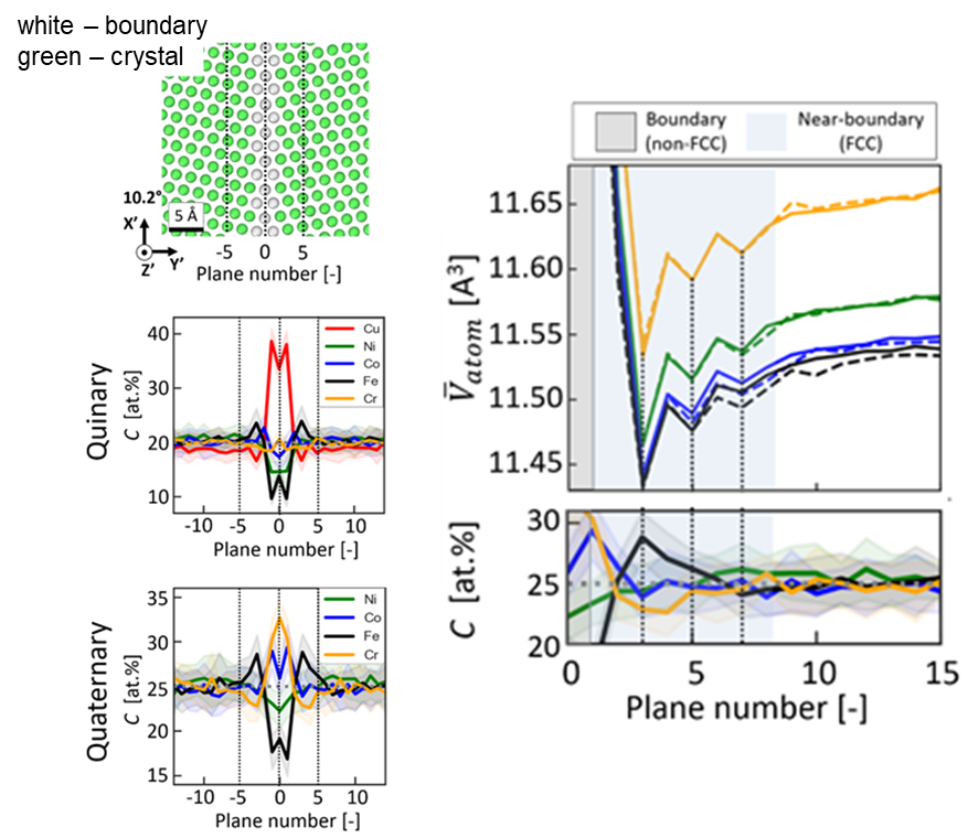 Using a unique set of metals called multi-principal element alloys (MPEAs), IRG-1 has shown that grain boundaries can have multiple levels of local structural and chemical heterogeneities that far surpass what was previously hypothesized. Not only does the boundary itself serve as a sink for dopants due to the local defects, but a thicker, near-boundary region has reduced free volume compared to the bulk and can be enriched in other atomic elements.