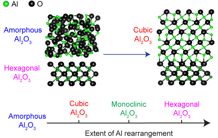 The approach used solid-phase epitaxy to crystallize Al2O3 from a disordered, amorphous precursor at low temperatures, which avoids forming the undesirable crystal structure. Computer simulations show that the desirable cubic crystal forms because the atoms in the disordered precursor move less to get to the cubic structure than to the hexagonal structure. The combination of experiments and simulations suggest that solid-phase epitaxy may be a general path to synthesizing selected crystal structures, even when there are several competing crystal structures.