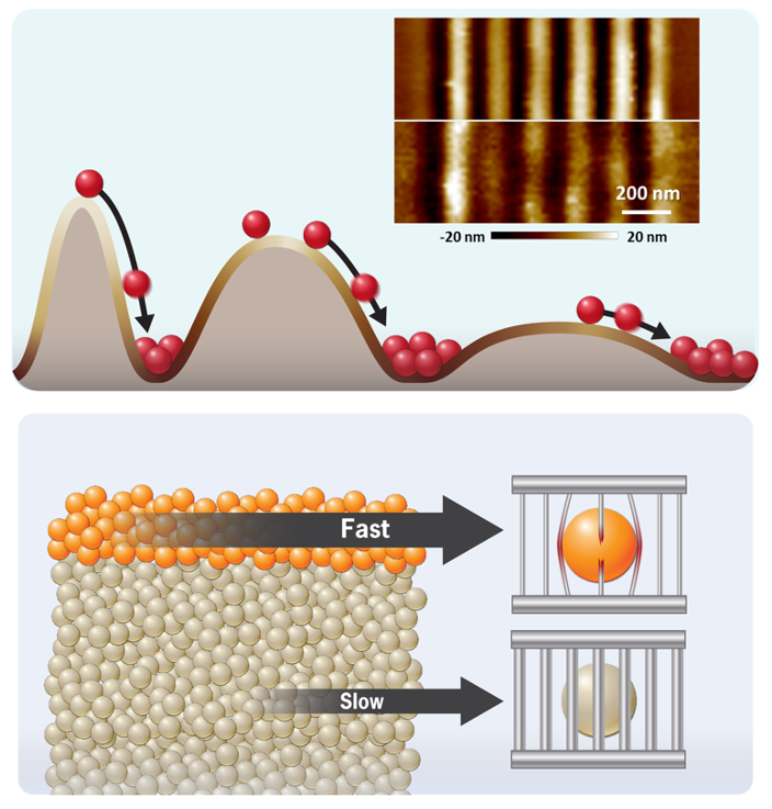 They found that atoms in glasses move by breaking out of a “cage” of nearby atoms. On the surface, that cage can be weaker than inside the glass, allowing for faster motion. They also discovered a relationship that predicts surface motion from more accessible data about bulk motion. Their results unify behavior for glasses of organic molecules, metals, and oxides and make creating glasses for applications like light-emitting diodes, quantum computers, and hard coatings easier.