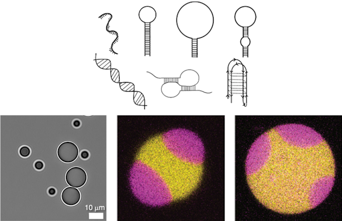 Top: Designed DNA structures of varying charge density and flexibility. Bottom left: Coacervate droplets formed from 1 DNA structure. Bottom middle/right: Binary droplets formed from a model system with 2 DNA structures.