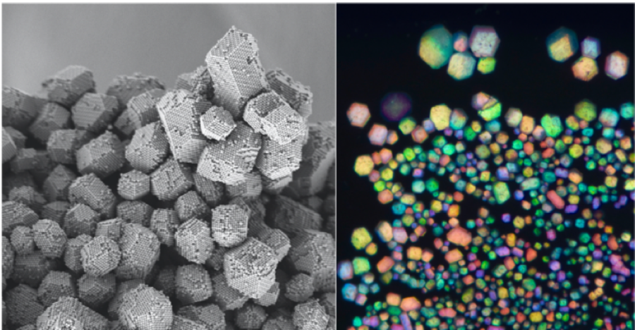Let’s consider the object shown in image A. At a first glance, the red-and-green magnified insert might resemble a colloidal crystal similar to those assembled from DNA-coated particles. A second look, however, reveals three important differences: (1) the crystal in the picture is macroscopic, a truly three- dimensional ‘gemstone’ visible to the naked eye, (2) it is a remarkably perfect single crystal, showing facets, and an habit that closely resembles that of an isostructural atomic crystal, and (3) it contains no DNA. Much like rock salt forming from oppositely charged ions, this colloidal crystal assembles from mixtures of plain colloidal particles through a process that we refer to as polymer- attenuated Coulombic self-assembly (PACS).