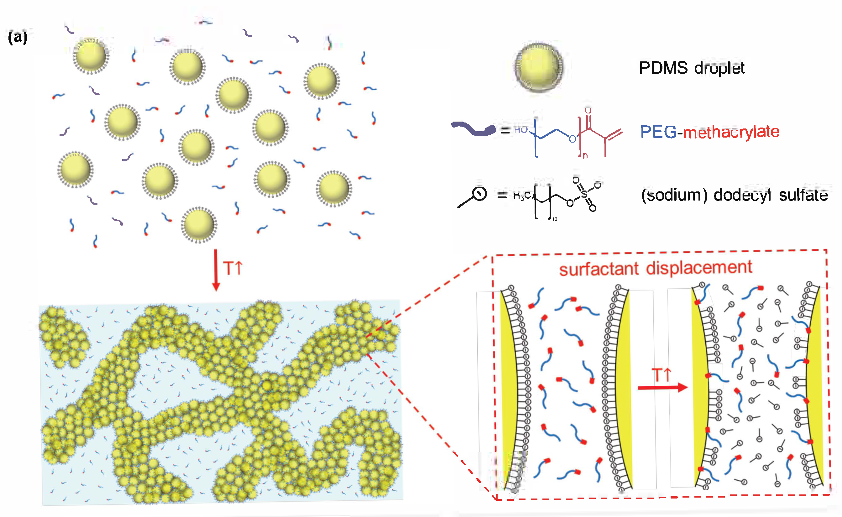 Doyle has discovered a new way to thermally-induce gelation of nanoemulsions. They developed a platform wherein colloidal gelation is controlled by tuning repulsive interactions. By including amphiphilic oligomers in colloidal suspensions, the ionic surfactants on the colloids are replaced by the nonionic oligomer surfactants at elevated temperatures, leading to a decrease in electrostatic repulsion. The mechanism was examined by carefully characterizing the colloids, and subsequently allowing the construction of interparticle potentials to capture the material behaviors. With the thermally-triggered surfactant displacement, the dispersion assembles into a macroporous viscoelastic network, and the gelling mechanism is robust over a wide range of compositions, colloid sizes and component chemistries. This stimulus-responsive gelation platform is general and offers new strategies to engineer complex viscoelastic soft materials.
