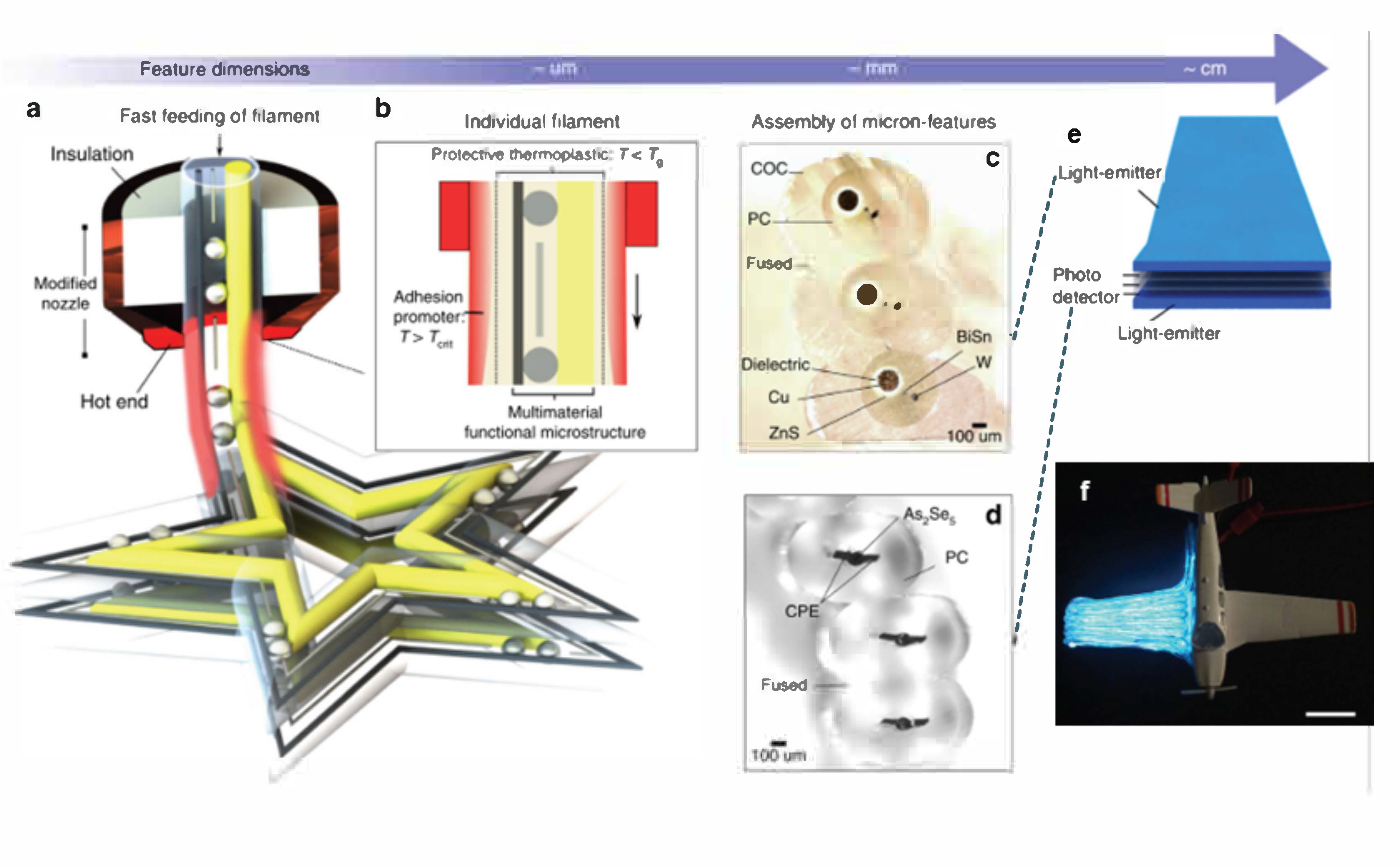 Functional fibers fabricated by the thermal drawing process can be used as feedstock for 3D printing. By applying an outer cladding with a lower Tg compared to that of the fiber core, the surface of the fiber can be heated to enable fused filament fabrication while the inner core is not affected (see Figure a-c).