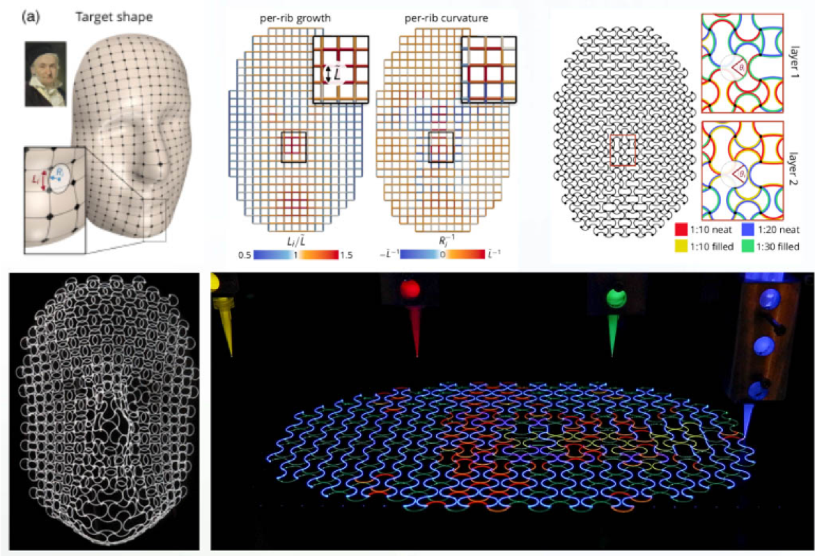 A team at the Harvard MRSEC led by Mahadevan and Lewis has created shape-shifting lattices by combining predictive design and multimaterial 4D printing. Inks composed of elastomeric matrices with tunable cross-link density and anisotropic fillers that enable precise control of their elastic modulus (E) and coefficient of thermal expansion (α) are printed in the form of lattices with curved bilayer ribs, whose composition geometry is locally programmed to achieve control over the metric tensor. By patterning bilayer ribs composed of four materials, the team can encode a wide range of 3-dimensional (3D) shape changes in response to temperature. As an exemplar, they designed and printed multimaterial planar lattices that morph into a human face (Gauss) that is geometric complex (see figure).