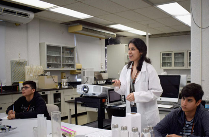 Adriana Santiago-Ruiz (Middle): Explaining details of the materials science experiment to the high school participants at “Experimenta con PREM”