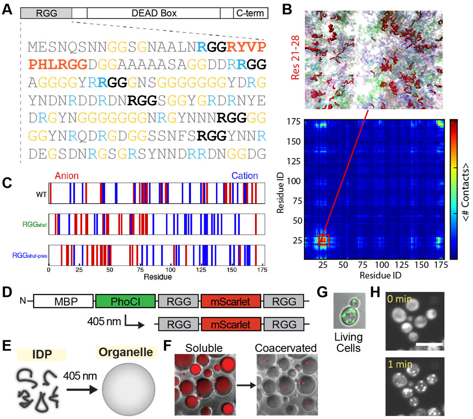 Fig. 1. A. Sequence of disordered RGG domain of Laf-1. B. Coarse-grain simulations identifies hydrophobic motif 21-28 that self-associates for condensation. C. Re-design of charge partitioning tunes phase behavior. D-F. Photocleavable RGG construct undergoes soluble to condensed transition upon 405 nm illum. G-H. Expression and optically induced condensation construct (D) in a model single cell system.