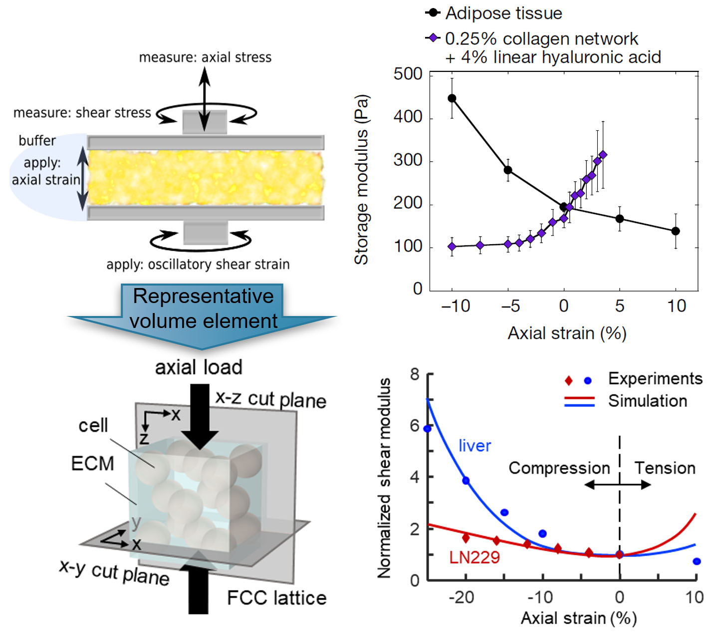The Janmey and Shenoy groups in IRG-2 studied multiaxial response of soft tissues (top left image). Measurements (Janmey) and a theoretical model (Shenoy) show that the tissue rheology emerges from an interplay between strain-stiffening polymer networks and the volume-conserving cells within them. Polymer networks that soften in compression but stiffen in extension can be converted to materials that stiffen in compression but not in extension by including either cells or inert particles within the network to restrict the relaxation modes of the surrounding fibrous networks (top right image). This result agrees with the predicted response of the network model from the Shenoy group (bottom images). The emergence of an elastic response in these composite materials has implications for how tissue stiffness is altered in disease and can lead to cellular dysfunction.