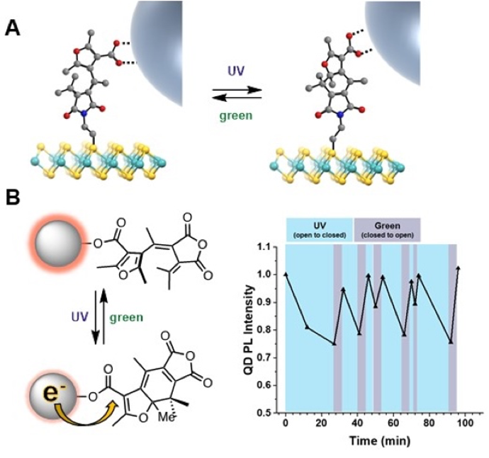 Two-dimensional semiconducting materials such as MoS2 can be photosensitized with a zero-dimensional system such as CdSe quantum dots (QDs) to enhance optoelectronic properties. Upon photoexcitation of the QDs, charge transfer occurs across the mixed-dimensional heterojunction interface to the underlying MoS2 in less than one picosecond. This Northwestern University MRSEC seed project is designing and building molecules to bridge the QD-MoS2 interface, thus enabling control over this ultrafast charge transfer. These photoswitchable molecules can be rapidly toggled between two different states using different colors of light. Since this toggling also occurs on the picosecond time scale, it can dynamically reconfigure the charge transfer process, leading to quenched QD photoluminescence. These results provide a novel pathway to ultrafast control of mixed-dimensional heterojunction charge transfer.