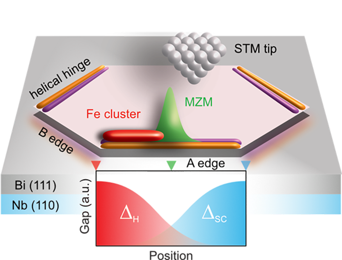 Majorana zero modes (MZMs) can serve as building blocks for topologically protected quantum computers, promising scalable and fault-tolerant quantum computation platforms in the future. Princeton MRSEC investigators Ali Yazdani and B. Andrei Bernevig have realized a novel material platform based on the topological hinge state of bismuth. Consistent with model calculations, their high-resolution STM experiments revealed the emergence of MZMs when the hinge state is influenced by ferromagnetic iron (Fe) clusters and superconductivity under suitable conditions. Spin-sensitive measurements detected the unique spin signature of MZMs, by which it can be distinguished from other states. Their work also presents perspectives to manipulate MZMs by controlling the magnetization of the Fe clusters, acting as nanoscale switches. Furthermore, the developed material platform lends itself to realizations using device-type experiments based on bismuth nano-ribbons. Such an approach will offer enhanced flexibility towards testing different MZMs’ manipulation and detection schemes in the future.