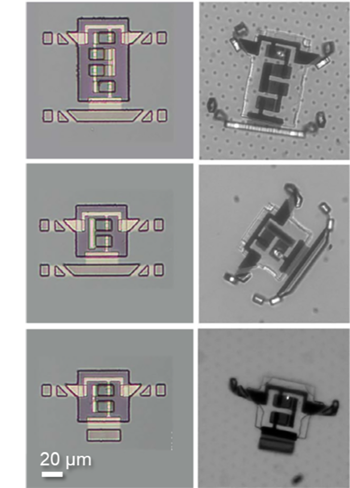 Fifty years of Moore’s Law scaling in microelectronics have brought remarkable opportunities for the rapidly-evolving field of microscopic robotics. Electronic, magnetic, and optical systems now offer an unprecedented combination of complexity, small size, and low cost, and could readily be appropriated to form the intelligent core of microscopic robots. But one major roadblock exists: there is no micron-scale actuator system that seamlessly integrates with semiconductor processing and responds to standard electronic control signals. Researchers at Cornell have now overcome this materials challenge by developing a new class of voltage-controllable electrochemical actuators that operate at low voltages (200 mV), and are completely compatible with silicon processing. The actuators are made of a 7-nm thin film of platinum capped on one side by titanium dioxide. When voltage is applied to the titanium, ions from the surrounding solution adsorb onto its uncapped surface causing surface stresses that bend the film. To demonstrate their potential, standard silicon fabrication was employed to make prototype sub-100-micron walking robots with these actuators. These results establish a clear pathway to mass-manufactured, complex and functional robots too small to be resolved by the naked eye.