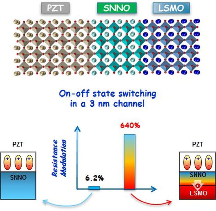 picture right: PZT-gated SNNO/LSMO composite channels exhibit significantly enhanced field effect switching due to interfacial charge transfer between SNNO and LSMO.