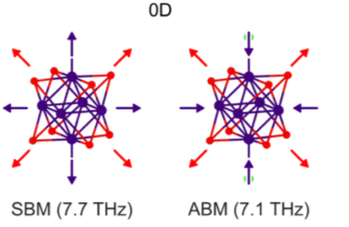 Using transient reflectance spectroscopy and theoretical calculations, we identify three different types of coherent phonons produced by optical excitation: localized 0D breathing modes of isolated superatom, 2D synchronized twisting of superatoms in layers, and 3D acoustic interlayer deformation. We show that these phonons are coupled to the electronic degrees of freedom to varying extents. The presence of local phonon modes in an extended crystal opens the door to controlling material properties from hierarchical phonon engineering.