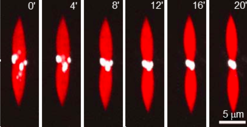 At the University of Chicago MRSEC, we have constructed active liquid droplets comprised of the biopolymer actin, crosslinker and molecular motors myosin. The motors spontaneously divide the droplets in half. Together, the Gardel, Vainkunation and Witten groups showed how liquid crystal droplets could explain the motor centering and droplet bisection. This work shows minimal elements in active soft matter for supporting morphogenic changes, as may have bene seen in primitive cells. The grph shows the Probability distribution for motors along the droplet long axis, binned at regular intervals as a function of distance from the droplet midplane, normalized to the droplet length LD (n=50 droplets)