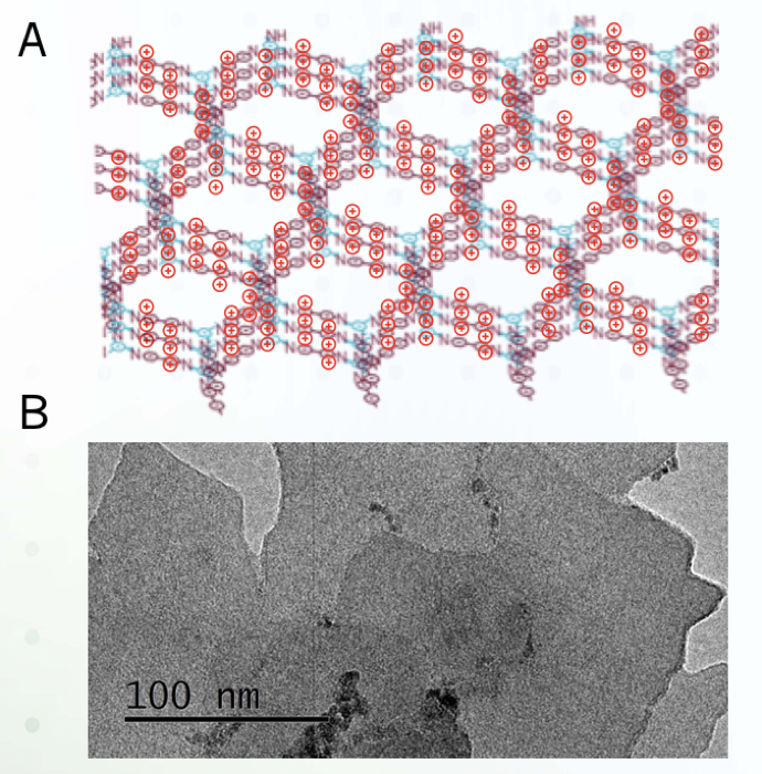 Two-dimensional covalent organic frameworks (2D COFs) are ordered, permanently porous polymers with intuitive designed structures. These molecularly precise porous materials are of high interest for separation membranes, organic electronic devices, catalyst supports, and related applications. However, 2D COFs are typically isolated as polycrystalline, insoluble powders that are not easily processed into forms that enable these potential applications. The NU-MRSEC Super-Seed team has developed a method to process imine-linked 2D COF powders into thin films via reversible exfoliation. The COF powder is treated with strong acids, which causes each layer to become positively charged. This charged form is exfoliated in solvents with gentle sonication, which provides a suspension of nanosheets. The suspension is cast on substrates and treated with base to obtain an insoluble thin film that retains the original 2D COF chemical structure and porosity. This processing advance enables 2D COF membranes on polymer supports that are promising for water filtration applications.