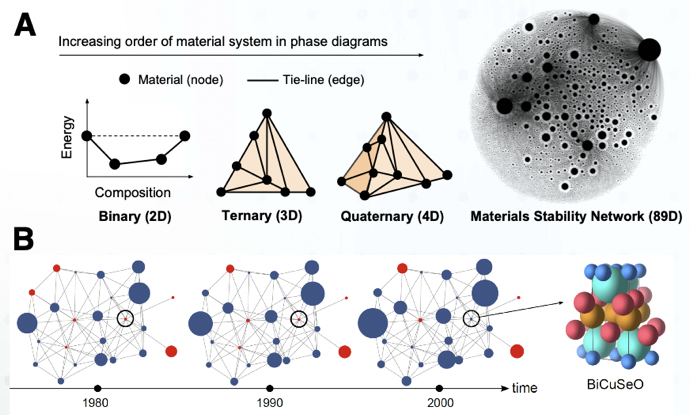 Materials synthesis is a complex process that depends not only on thermodynamic stability, but also on kinetic factors, advances in synthesis techniques, and the availability of precursors. This complexity makes the development of a general theory for predicting synthesizability extremely difficult. In NU-MRSEC IRG-2, a novel approach for predicting synthesizability has emerged from the dynamics of the “materials stability network,” by combining network representations of materials phase diagrams calculated with density functional theory and experimental discovery timelines extracted from citations. The time-evolution of the underlying network allows machine-learning to predict the likelihood that hypothetical, computer-generated materials will be amenable to experimental synthesis.